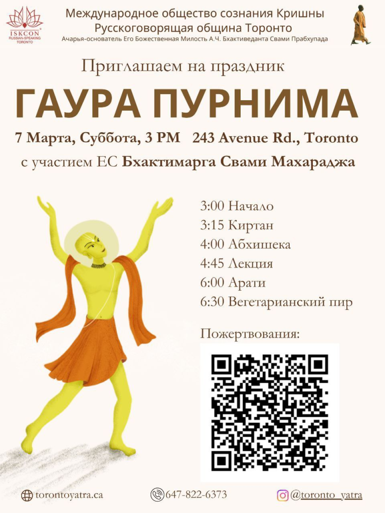 Мы с радостью приглашаем вас на праздник 💛 Гаура Пурнима💛 — день явления Господа Чайтаньи Махапрабху, который является самым милостивым воплощением Господа, открывшим нам радость воспевания святых имен✨