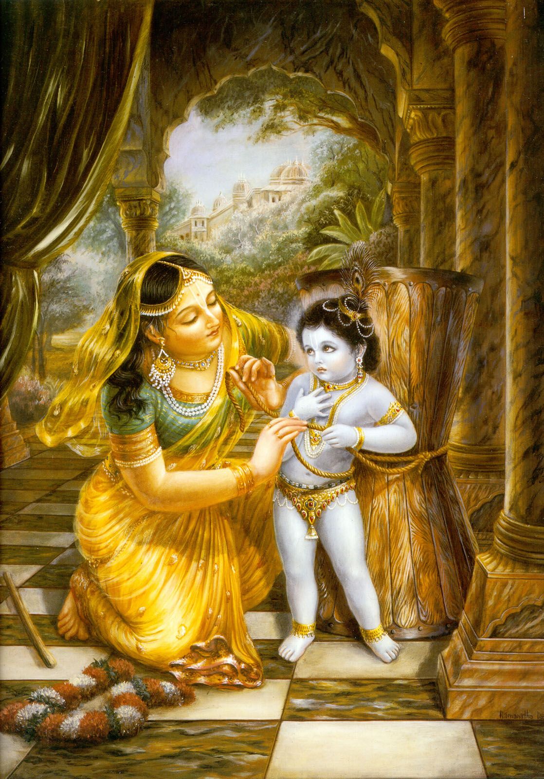 Перевод: Он плачет, (увидев хворостину в руке Своей матери), и утирает слезы Своими лотосными ладошками. Его глаза полны страха, а жемчужное ожерелье на Его шее, отмеченной тремя линиями, подобными линиям на раковине, дрожит от частого дыхания, прерываемого плачем. Этому Верховному Господу, Шри Дамодаре, чей живот обвит не веревками, а чистой любовью Его матери, я приношу смиренные поклоны.